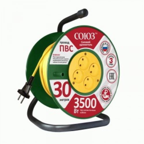 - Удлинитель силовой на катушке, 4 роз., б/з, 16А, ПВС 2x1,5 мм, 30 м СОЮЗ