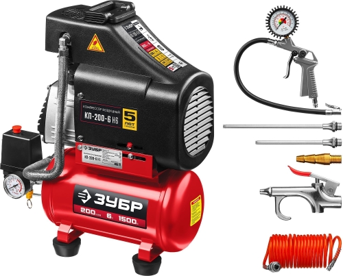 - Компрессор воздушный безмасляный с набором аксессуаров, 200 л/мин, 6 л, 1500 Вт, ЗУБР
