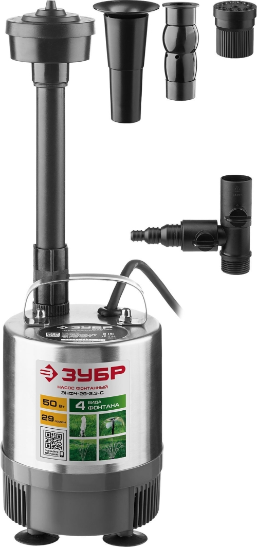 - Насос фонтанный, ЗУБР ЗНФЧ-29-2.3-C, нерж сталь, для чистой воды, напор 2,3 м, насадки: колокольчик, гейзер, каскад, 50Вт, 29 л/мин