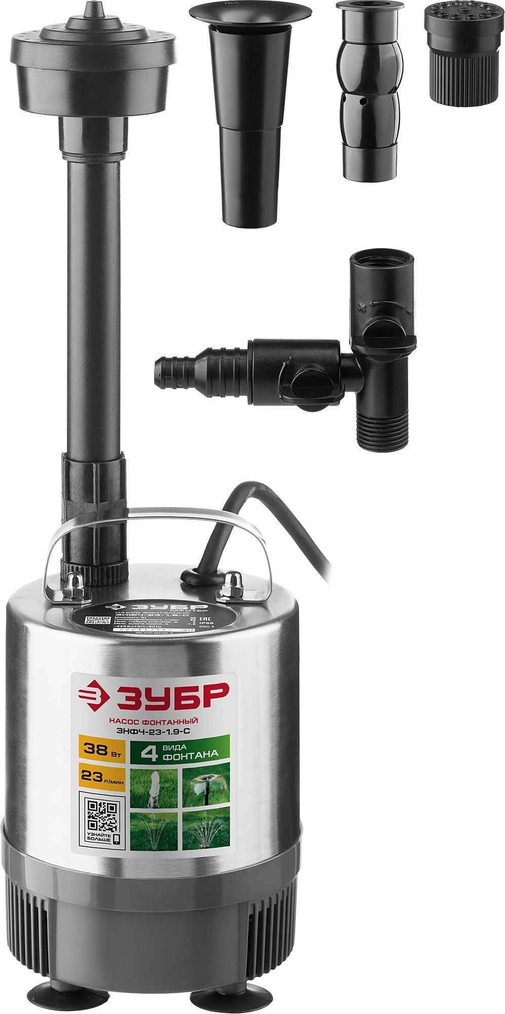Насос фонтанный, ЗУБР ЗНФЧ-33-2.5, для чистой воды, напор 2,5 м, насадки: колокольчик, гейзер, каскад, 50 Вт, 33 л/мин
