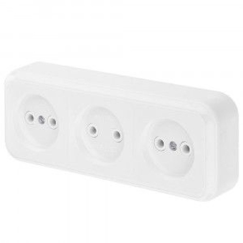 Описание товара: Трехместная электрическая розетка без заземляющего контакта, О/У - открытой установки. Конструктивно механизм электророзетки состоит из термостойкого электротехнического композитного материала, электрических контактов для электровилки выполненных из высокоупругой фосфористой бронзы и клемм для фиксации токопроводящего провода. Корпус произведен из облегченного износостойкого ABS-пластика белого цвета.